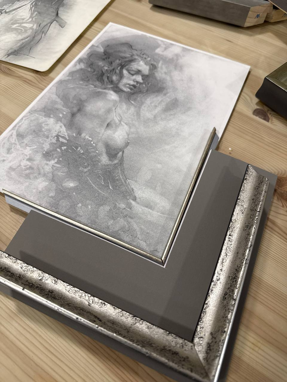 Чтобы сделать процесс выбора более удобным, мы рекомендуем прислать фотографии ваших работ или, по возможности, привезти их к нам в мастерскую. Это позволит нам предложить несколько вариантов оформления, используя образцы багетов и паспарту. Так вы сможете увидеть, как будет выглядеть ваша картина в разных рамках.